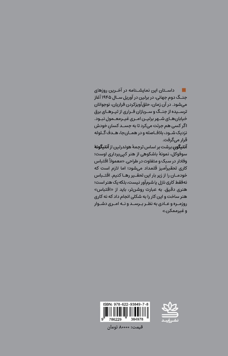 آنتیگون برشت بر اساس ترجمۀ هولدرلین از آنتیگونهٔ سوفوکل، نمونۀ باشکوهی از هنر کپیبرداری اوست؛ وفادار در سبک و متفاوت در طراحی. «معمولا اقتباس کاری تحقیرآمیز قلمداد میشود؛ اما لازم است که خودمان را از زیر بار این تحقیر رها کنیم. اقتباس نهفقط کاری نازل یا شرمآور نیست، بلکه یک هنر است؛ هنری دقیق. به عبارت روشنتر، باید از «اقتباس» هنر ساخت و این کار را به شکلی انجام داد که نه کاری روزمره و عادی به نظر برسد و نه امری دشوار و غیرممکن.»