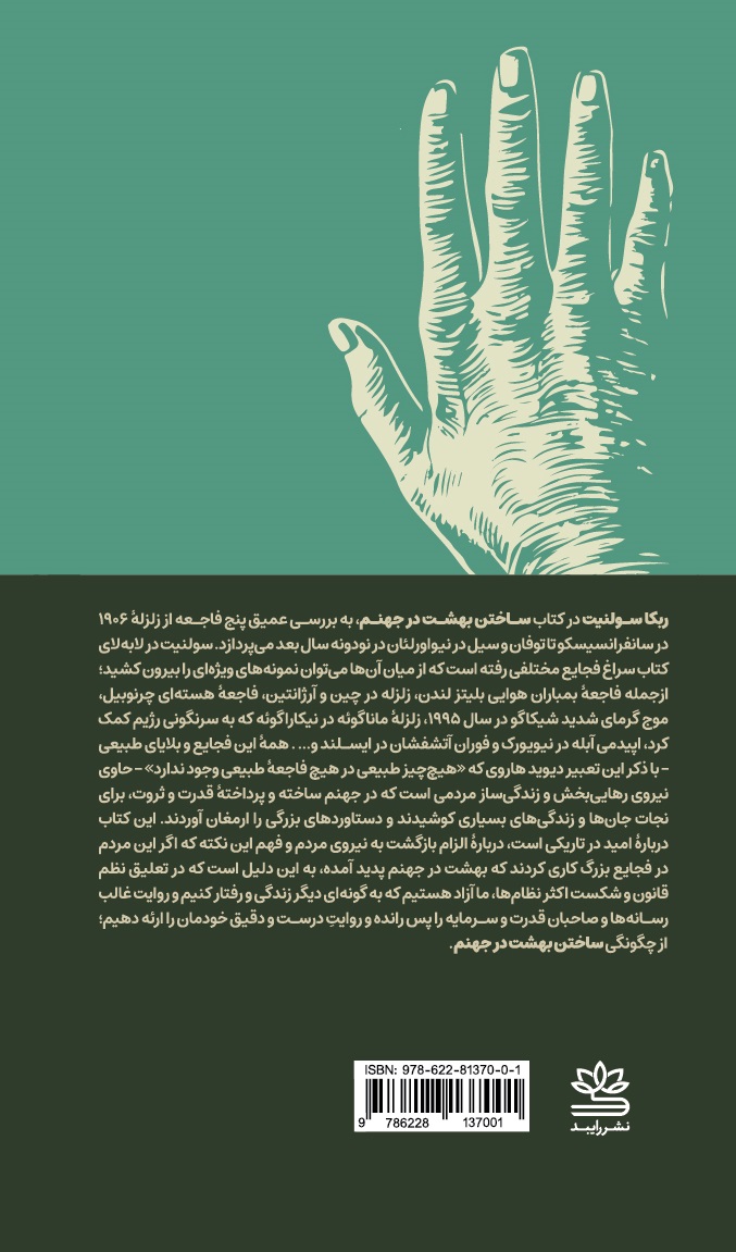 ربکا سولنیت در کتاب ساختن بهشت در جهنم، به بررسی عمیق پنج فاجعه از زلزلۀ 1906 در سانفرانسیسکو تا توفان و سیل در نیواورلئان در نودونه سال بعد میپردازد. سولنیت در لابهلای کتاب سراغ فجایع مختلفی رفته است که از میان آنها میتوان نمونههای ویژهای را بیرون کشید؛ ازجمله فاجعۀ بمباران هوایی بلیتز لندن، زلزله در چین و آرژانتین، فاجعۀ هستهای چرنوبیل، موج گرمای شدید شیکاگو در سال 1995، زلزلۀ ماناگوئه در نیکاراگوئه که به سرنگونی رژیم کمک کرد، اپیدمی آبله در نیویورک و فوران آتشفشان در ایسلند و… . همۀ این فجایع و بلایای طبیعی – با ذکر این تعبیر دیوید هاروی که «هیچچیز طبیعی در هیچ فاجعۀ طبیعی وجود ندارد» – حاوی نیروی رهاییبخش و زندگیساز مردمی است که در جهنم ساخته و پرداختۀ قدرت و ثروت، برای نجات جانها و زندگیهای بسیاری کوشیدند و دستاوردهای بزرگی را ارمغان آوردند. این کتاب دربارۀ امید در تاریکی است، دربارۀ الزام بازگشت به نیروی مردم و فهم این نکته که اگر این مردم در فجایع بزرگ کاری کردند که بهشت در جهنم پدید آمده، به این دلیل است که در تعلیق نظم قانون و شکست اکثر نظامها، ما آزاد هستیم که به گونهای دیگر زندگی و رفتار کنیم و روایت غالب رسانهها و صاحبان قدرت و سرمایه را پس رانده و روایت درست و دقیق خودمان را ارئه دهیم؛ از چگونگی ساختن بهشت در جهنم.